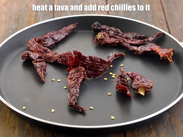 - To make kadai gravy, combine the red chillies and coriander seeds and dry roast on a hot tava (griddle), for 30 seconds.