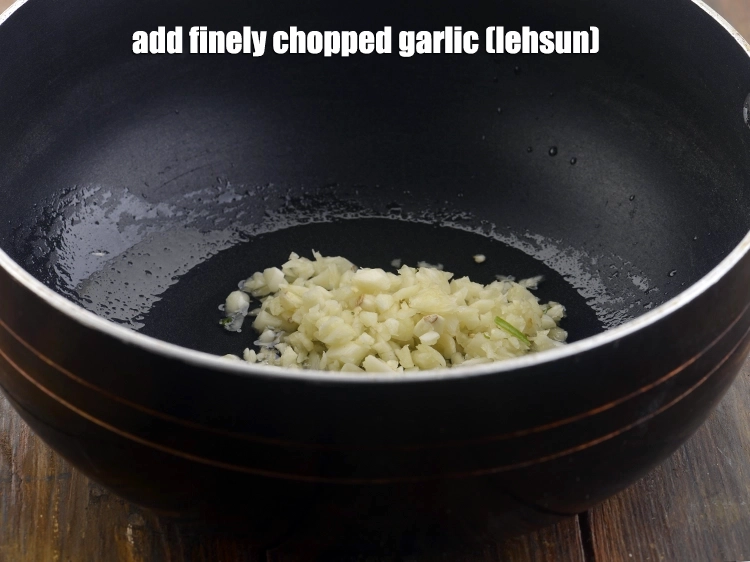 Heat the 2 1/2 tbsp oil in a kadhai, and add the 2 tbsp finely chopped garlic (lehsun) into it.