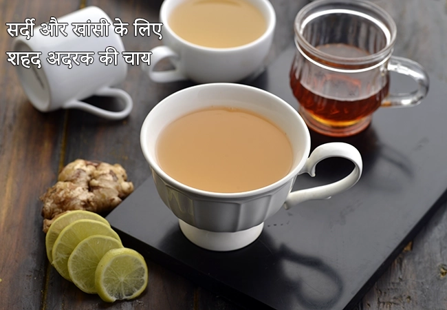 सर्दी और खांसी के लिए यह सुखदायक और सुगंधित सशहद अदरक की चाय सर्दी और खांसी के लिए एक अच्छा घरेलू उपाय है। अदरक को गर्म उबलते पानी में डाले और नींबू के रस और शहद के साथ मिलाकर पीने से भी काफी राहत मिलती है।