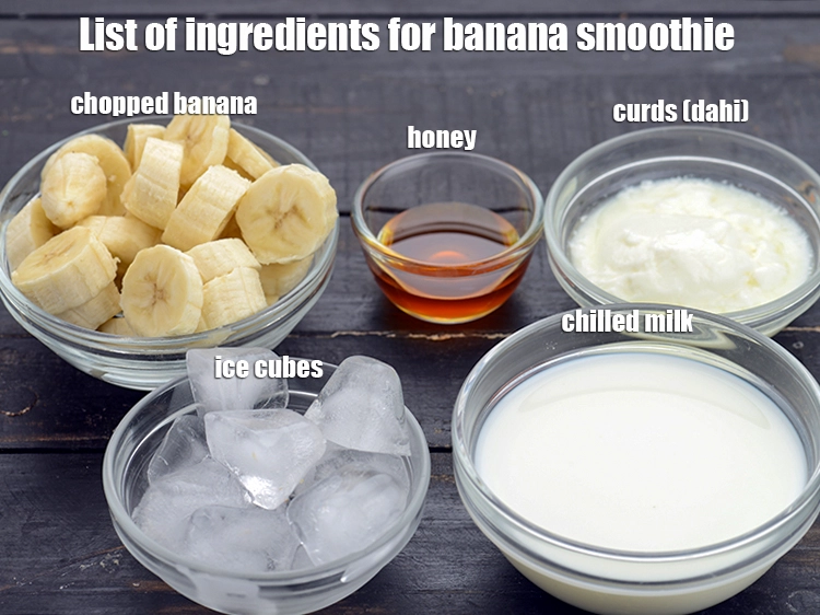 banana smoothie recipe | healthy banana smoothie | Indian banana smoothie | banana and honey smoothie, is made of cheap and easily available ingredients in India: 1 cup chopped banana, ¼ cup curds (dahi), ½ cup chilled milk, 10 ice cubes and 1 tbsp honey. See the below image of list of ingredients for banana smoothie.