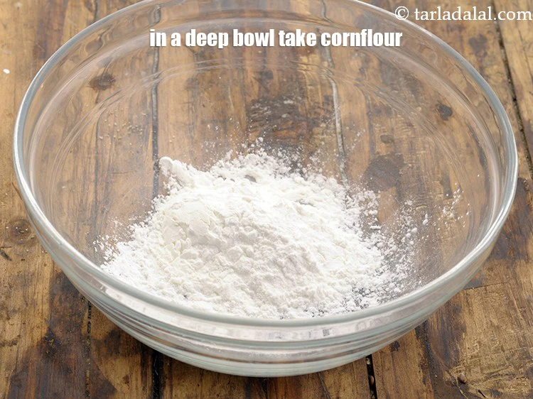 The Chinese white sauce is basically mildly flavored, creamy sauce made using clear vegetable stock, thickened with cornflour and enhanced with alliums. To thicken the clear vegetable stock, we would require a cornflour slurry. In a deep bowl take 3 tbsp cornflour. Use tapioca or arrowroot flour if you're planning to freeze the Chinese white sauce.