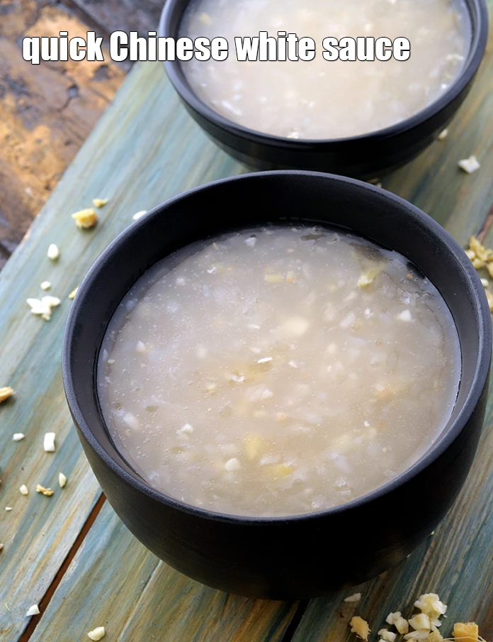 Chinese white sauce is quick and easy to make. To make it even more time efficient, prepare the vegetable stock well in advance. The Chinese white sauce is basically mildly flavored, creamy sauce made using clear vegetable stock, thickened with cornflour and enhanced with alliums.
