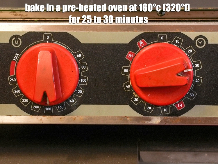 4. bake in a pre-heated oven at 160°c (320°f) for 25 to 30 minutes.