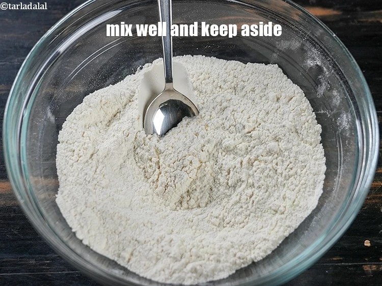 1. Sieve the flour and the baking powder in a deep bowl, add the milk powder, mix well and keep aside.