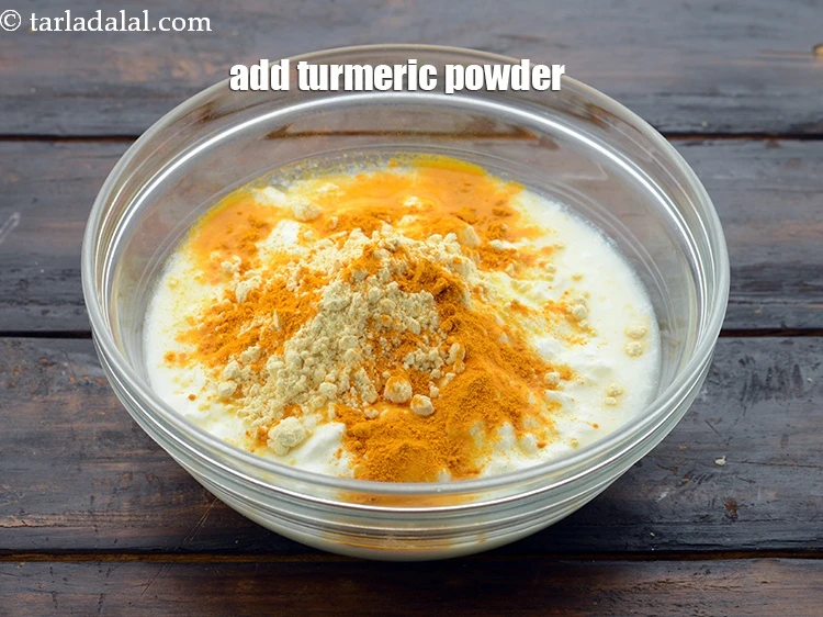 - दही, बेसन, हल्दी पाउडर, हरी मिर्च का पेस्ट, लाल मिर्च पाउडर, नमक और 1/2 कप पानी को एक गहरे बाउल में अच्छी तरह मिला ले और फेंट लें, जिससे डल्ले ना रहें। एक तरफ रख दें।