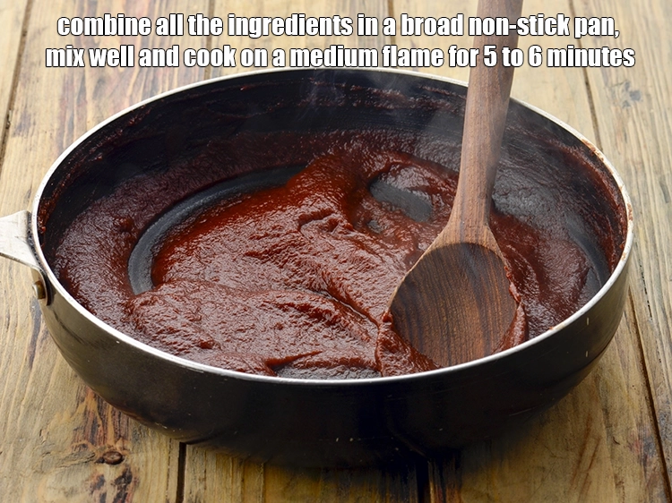 To make the Hot and Sweet Sauce, in a broad non-stick pan, put 1/2 cup tomato puree, 2 tsp sugar, 1 tbsp vinegar, 1 tbsp chilli powder, 3 tbsp tomato ketchup mix well and cook on a medium flame for 5 to 6 minutes, while stirring occasionally.