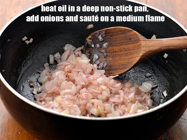- એક ઊંડા નૉન-સ્ટીક પૅનમાં તેલ ગરમ કરો, તેમાં કાંદા નાખો અને મધ્યમ આંચ પર ૬ મિનિટ માટે સાંતળી લો