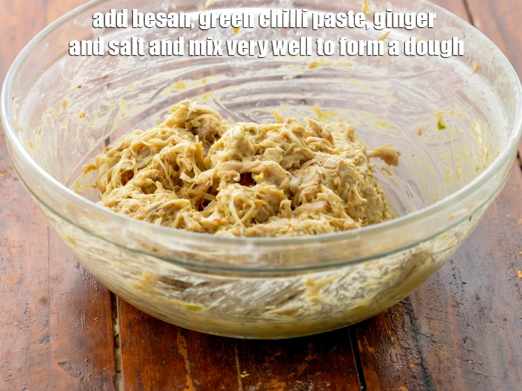 - તેમાં બેસન, લીલા મરચાની પેસ્ટ, આદુ અને મીઠું નાંખો અને ખૂબ સારી રીતે મિક્સ કરી કણક તૈયાર કરી લો.