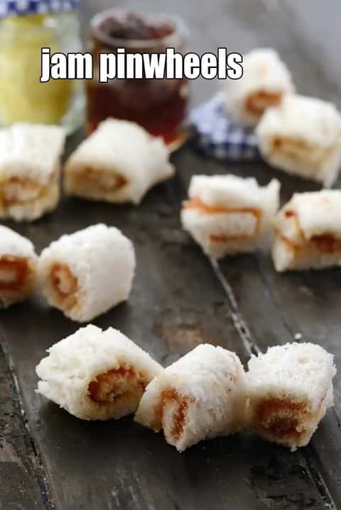 jam pinwheels recipe | strawberry jam pinwheel sandwich kids snack | Indian sweet pinwheels | how to make jam pinwheels | with 10 amazing images.