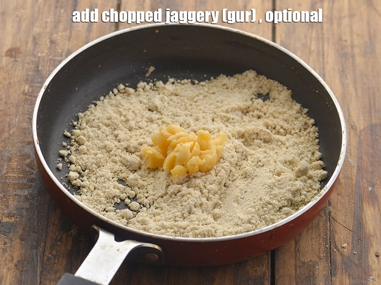 Add the 1 tsp chopped jaggery (gur) , optional. We have suggested to use chopped jaggery, but you can use grated jaggery also. Moreover use of jaggery is totally optional.