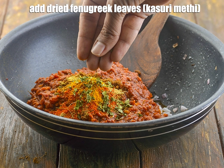 15. ग्रेवी को स्वाद देने के लिए 1 टी-स्पून कसुरी मेथी (dried fenugreek leaves (kasuri methi) डालें।