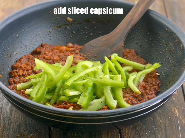 11. अब, 1/2 कप स्लाईस्ड शिमला मिर्च (sliced capsicum) डालें।
