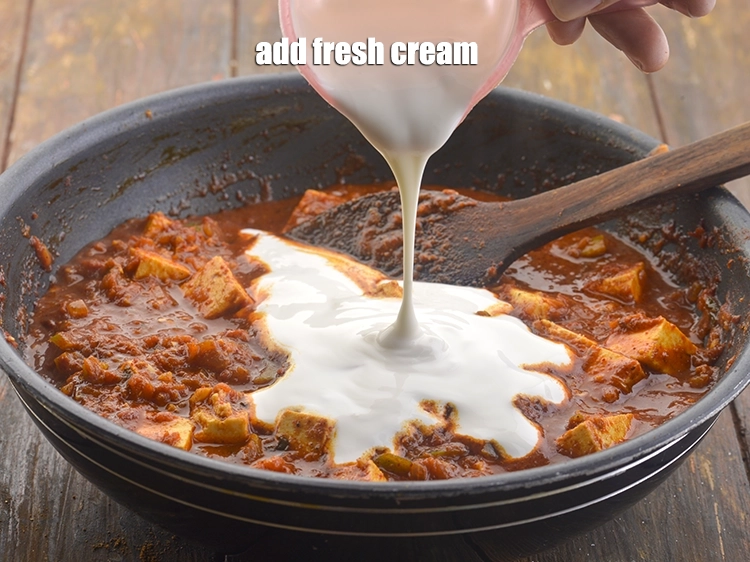 6. क्रीम डालें, अच्छी तरह मिलाएँ और धनिए से सजाकर कढ़ाई पनीर को गर्मागर्म परोसें।