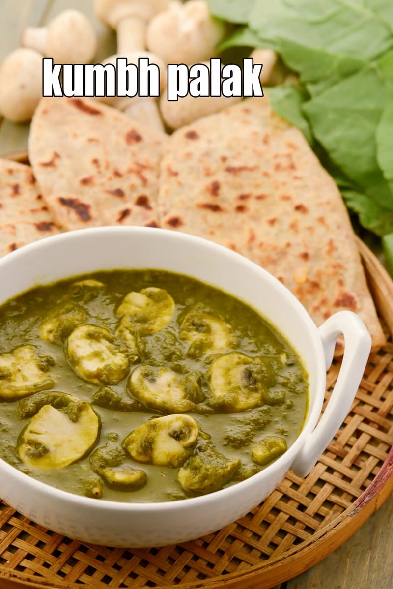 Serve kumbh palak | mushroom spinach Indian curry | healthy palak mushroom sabzi | hot with bajra or jowar roti.