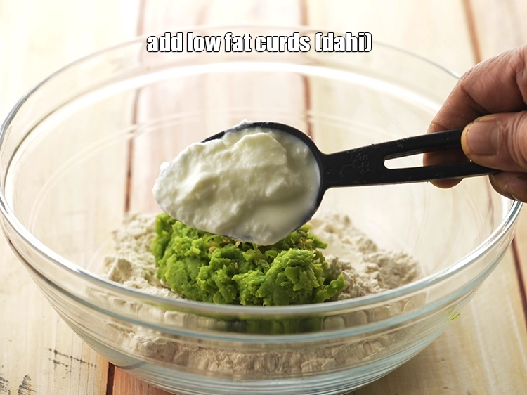 1 टेबल-स्पून लो फॅट दही (low fat curds) डालें। दही पराठे को नरम बनाने में मदद करता है और यह आटे को बांधने में भी मदद करता है, क्योंकि हम रेसिपी में पानी का इस्तेमाल नहीं कर रहे हैं।
