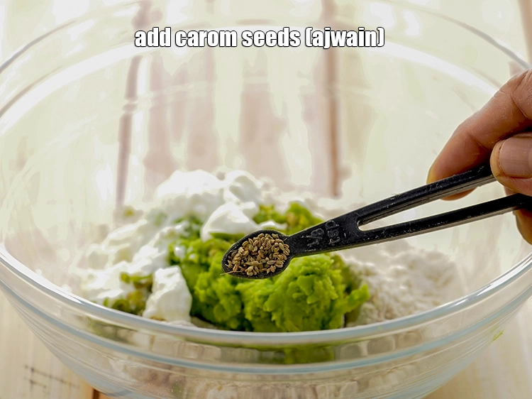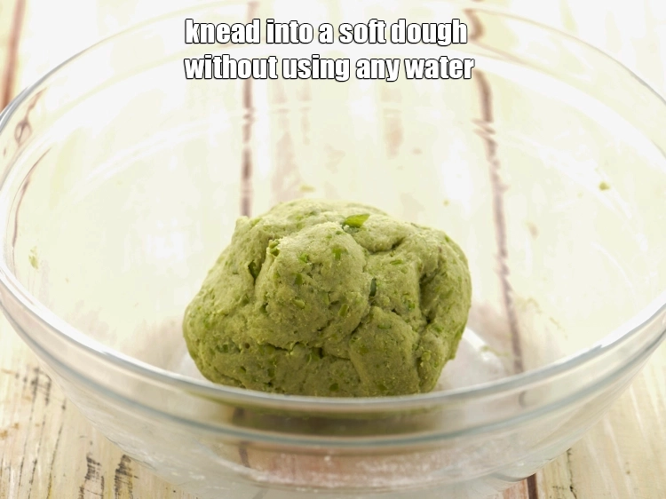 आटा तैयार करने के लिए, ब्लेंडर में उबली हुई हरी मटर का एक चिकना पेस्ट बनाकर शुरू करें। एक कटोरे में, इस प्यूरी को साबुत गेहूँ का आटा, कम वसा वाला दही (low fat curds/dahi), हरी मिर्च (स्वाद के लिए), अजवाइन (carom seeds/ajwain), और स्वादानुसार नमक के साथ मिलाएं। कम वसा वाले दही का उपयोग नरम आटे की बनावट प्राप्त करने और अत्यधिक वसा के बिना प्रोटीन जोड़ने के लिए किया जाता है। पर्याप्त पानी का उपयोग करके नरम आटा गूंथ लें (Knead into a soft dough) और आटे को 5 बराबर भागों में बाँट लें (divide the dough into 5 equal portions)।