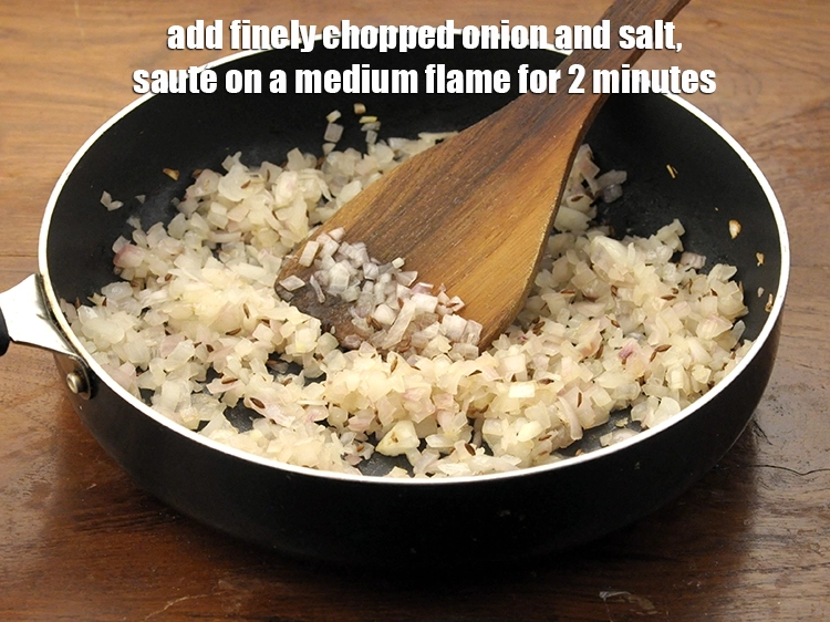 When the seeds crackle, add the 1 cup finely chopped onion and salt to taste and sauté on a medium flame for 2 minutes.
