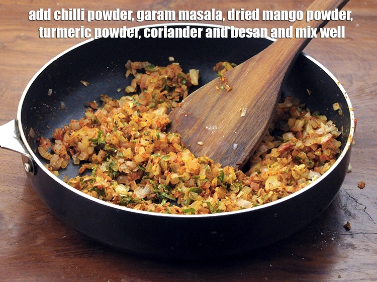 Remove from the flame, add the 1 tsp chilli powder, 1/2 tsp garam masala, 1/2 tsp dried mango powder (amchur), 1/4 tsp turmeric powder (haldi), 2 tbsp chopped coriander (dhania) and 1 tbsp besan (Bengal gram flour) and mix well. Keep aside.