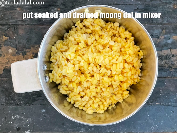 પલાળેલી અને પાણી કાઢી નાખેલી મગની દાળને મિક્સરમાં નાખો.