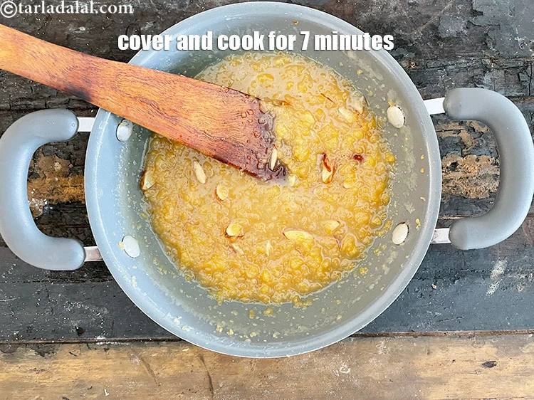 - સાકર અને બદામ ઉમેરો અને બરાબર મિક્સ કરો. ઢાંકણથી ઢાંકી ધીમા તાપ પર ૫ થી ૭ મિનિટ સુધી વચ્ચે થોડા-થોડા સમયે હલાવતા રહી રાંધી લો.