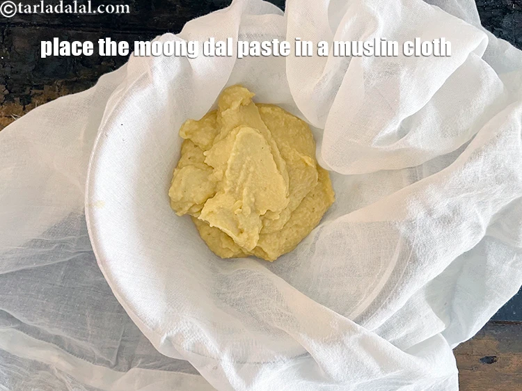 - મૂંગની દાળની પેસ્ટને મસમલના કાપડમાં મૂકીને દબાવીને વધારાનું પાણી કાઢી નાખો. મલમલનાં કાપડમાંથી મૂંગની દાળની પેસ્ટને પ્લેટમાં કાઢો અને ચમચીની મદદથી તેને ફેલાવી દો. એક બાજુ રાખો.