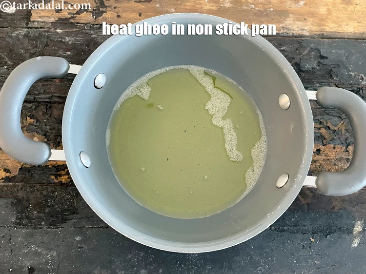 ઝડપી મૂંગ દાળ શીરા બનાવવાની રેસીપી | ઇન્સ્ટન્ટ શીરા | 20 મિનિટ શીરા | બનાવવા માટે, એક પહોળા નોન-સ્ટીક પેનમાં 1/2 કપ ઘી ગરમ કરો. ઘી હલવાને સમૃદ્ધ અને સ્વાદિષ્ટ બનાવે છે.