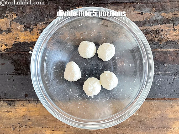 - કણિકને 5 સરખા ભાગોમાં વહેંચો અને દરેક ભાગને ગોળ ગોળ ફેરવો.