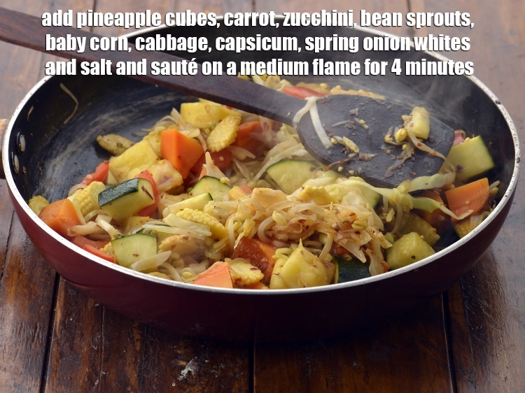Add the 1/2 cup pineapple cubes, 1/2 cup blanched carrot, 1/2 cup zucchini cubes, 1/2 cup bean sprouts, 1/2 cup diagonally cut baby corn, 1/2 cup shredded cabbage, 1/2 red capscium cubes, 1/2 cup thinly sliced spring onions whites and salt to tasteand sauté on a medium flame for 4 minutes.