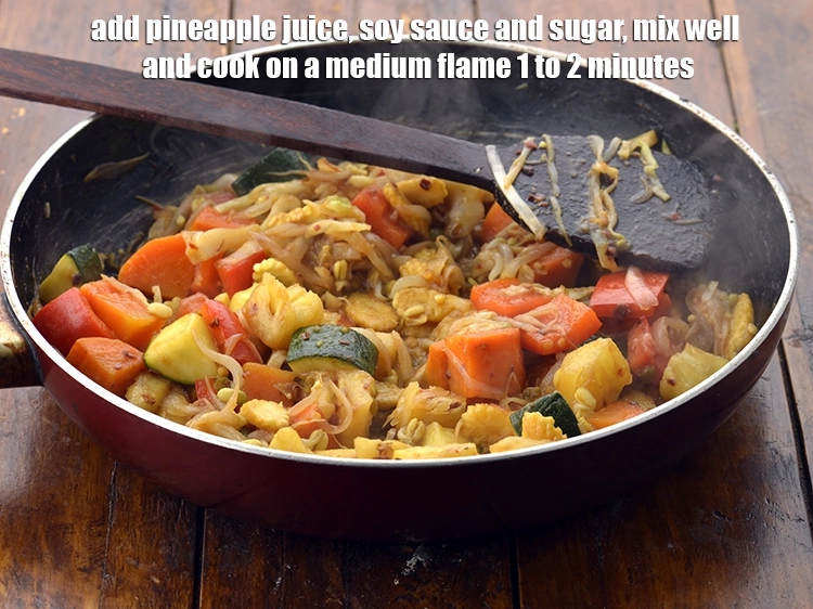 - Add the pineapple juice, soy sauce and sugar, mix well and cook on a medium flame 1 to 2 minutes, while stirring occasionally.
