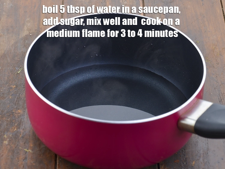 - Boil 5 tbsp of water in a saucepan, add the sugar, mix well and cook on a medium flame for 3 to 4 minutes, while stirring occasionally.