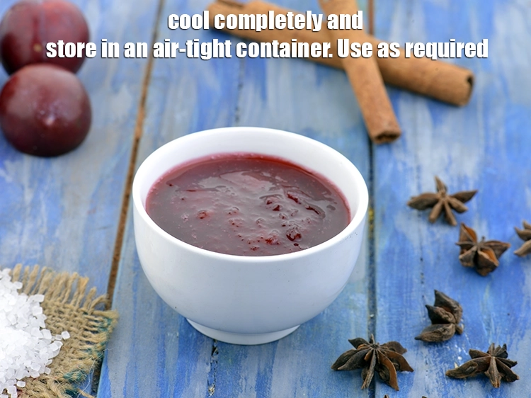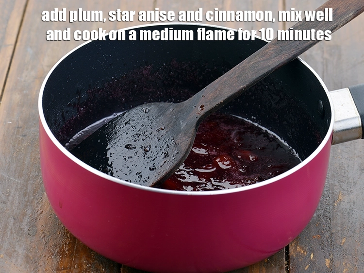 - Add the plum, star anise and cinnamon, mix well and cook on a medium flame for 10 minutes, while stirring occasionally.