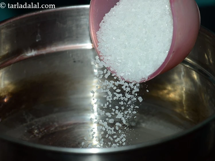 - એક સ્ટીમર અથવા પ્રેશર કુકરમાં 5 કપ પાણી અને ખાંડ ઉમેરો અને ખાંડ સંપૂર્ણપણે ઓગળી જાય ત્યાં સુધી, વચ્ચે-વચ્ચે હલાવતા રહીને, ઉકાળો.