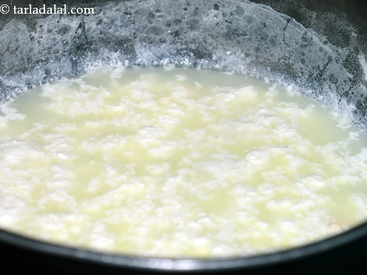 - તેને ફાટવા માટે ½ મિનિટ સુધી રહેવા દો. જ્યારે છેના અને મટ्ठा (લીલાશ પડતું પાણી) અલગ થઈ જાય ત્યારે તે સંપૂર્ણપણે ફાટી ગયું છે એમ સમજવું.