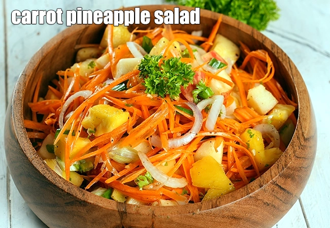 carrot pineapple salad recipe | pineapple carrot Indian salad with onions | phosphorus and fibre rich fruit veg salad | pineapple carrot Indian salad with onions is a succulent salad of carrots, pineapples, apple, parsley and spring onions perked up with a dressing of extra virgin olive oil, ginger, garlic and sea salt.