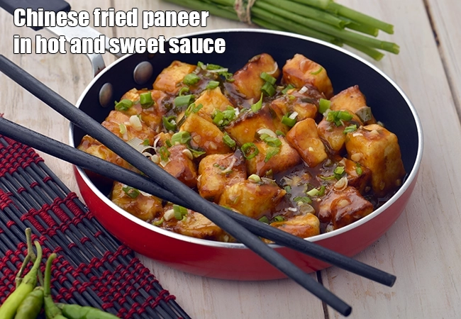 Oh-So-Crisp from the outside and soft in the inside, this Chinese Fried Paneer in Hot and Sweet Sauce is a tongue-tickling combination of sauces perked up with garlic, ginger, spring onion.