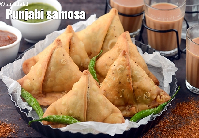 The traditional Punjabi Samosa is large and its filling is mainly made up of potatoes and peas. You can even add chopped cashew nuts and raisins to make them a rich and tasty snack.