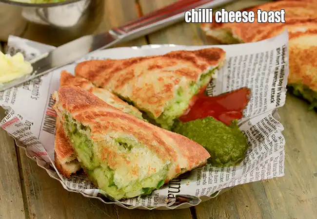 Our chilli cheese toast recipe is a veg chilli cheese toast made on a sandwich toaster. On Mumbai’s streets, chilli cheese toast is an elaborate treat, of chutney-coated bread topped with a succulent mixture of cheese, capsicum and green chillies. We prefer making the veg chilli cheese toast in sandwich toaster as the result is a more crisp toast than that made on a tawa.