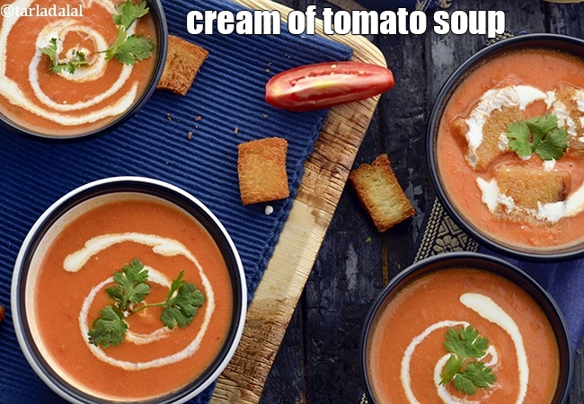 Cream of tomato soup is a tomato based thick soup which is probably the first choice as an appetizer to be had before the meal, when we go outdoors. This is a popular winter recipe in India. I love having cream of tomato soup on rainy days and it is my comfort food in soups.