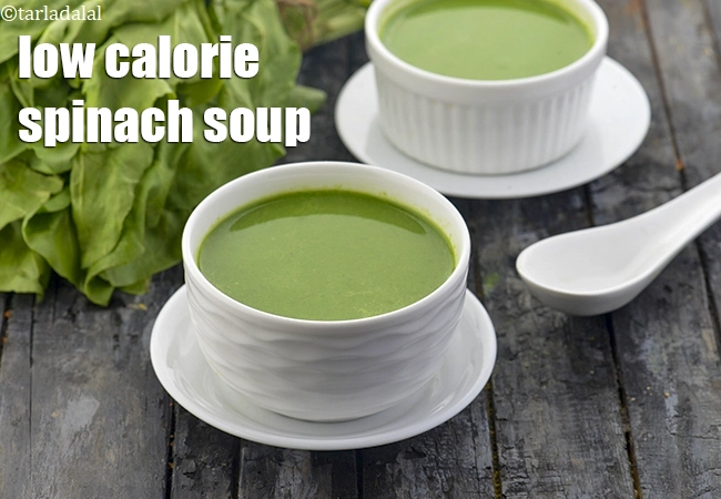 Low calorie Palak (Spinach) Indian Soups. Palak is cheap and always present in Indian kitchens. You will thoroughly enjoy this nutrient-dense, easy-to-prepare low calorie spinach soup recipe. Cooking it with low-fat milk gives it a lovely emerald green colour, which together with the aroma of sautéed onions and garlic, makes this soup irresistible! 49 calories for low cal spinach soup is especially recommended for all the weight-conscious readers.