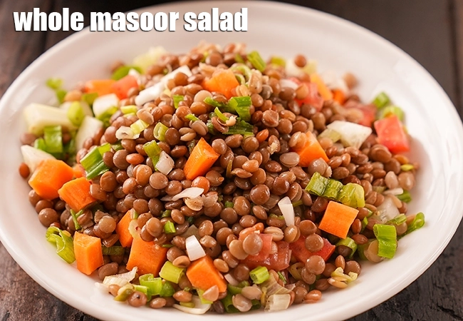 whole masoor salad is a nutritious Indian salad made from whole masoor dal (red lentils), which are rich in protein, fiber, and various vitamins and minerals. This salad is not only healthy but also very versatile, allowing for various ingredients based on personal preference.
