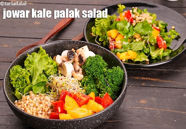 jowar kale palak salad recipe | spinach, capsicum, alfalfa sprouts salad | healthy jowar vegetable salad | One serving of jowar kale palak salad delivers 34% folic acid, 100% vitamin B1, 18% protein, fiber 39%, iron 94%, 42% magnesium, Phosphorous 39% of your Recommended Dietary Allowance ( RDA).