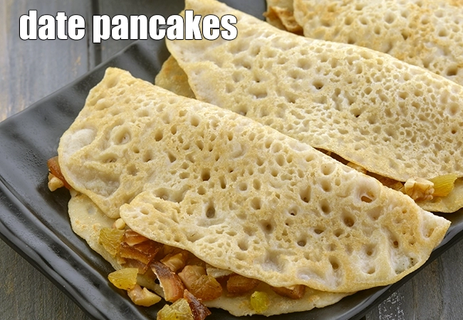 date pancakes recipe | eggless date pancakes | Indian date pancakes with nuts | healthy whole wheat khajur … More..