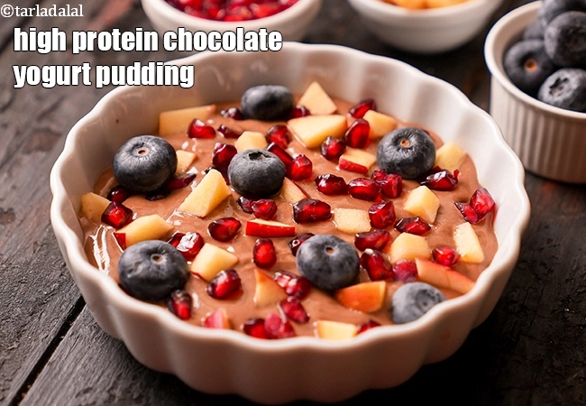 high protein chocolate yogurt pudding recipe | calcium rich Indian pudding with fruits | healthy unsweetened whey protein chocolate pudding | 36 grams protein dessert | A single serving of high protein chocolate yogurt pudding delivers 52% ( 313.5 mg) of RDA of your daily calcium needs. NOTE that yoghurt and apples are good for the heart.