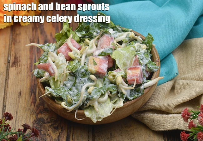 spinach and bean sprouts in creamy celery dressing recipe | palak, lettuce and bean sprout salad | healthy Indian bean sprouts salad