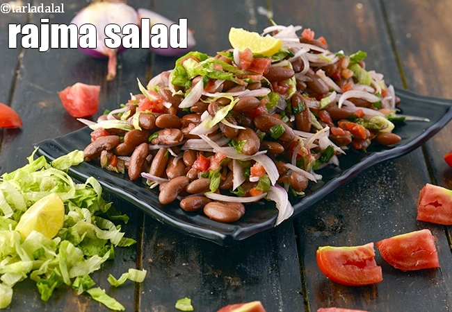 rajma salad recipe is a fairly quick salad to make. The ingredients to make rajma salad are rajma, onions, tomatoes, spring onions, shredded lettuce and an olive oil dressing.