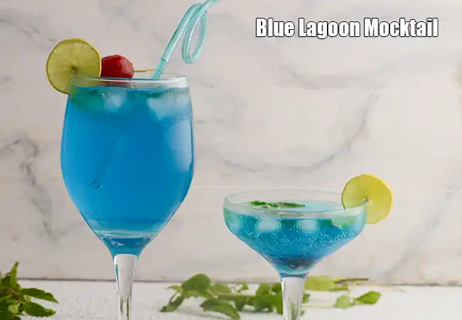 Blue Lagoon Mocktail is a striking blue-coloured fizzy drink.