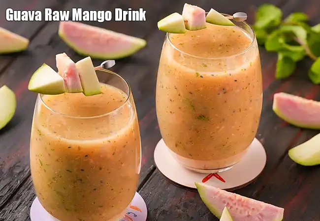 Guava Raw Mango Drink is a refreshing Indian-style mocktail that blends the sweetness of ripe guava with the tangy flavour of raw mango. This drink has a perfect balance of sweet, sour, and mildly spicy notes. It is especially popular during summer as a cooling and energising beverage. The combination of fruits gives a unique taste with a pleasant aroma. Guava Raw Mango Drink is best served chilled and works well as a welcome drink or afternoon refresher.