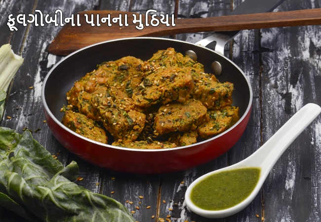 ફૂલગોબીના પાનના મુઠિયા ની રેસીપી | Cauliflower Greens and Besan Muthia. ફૂલકોબીના લીલા શાકભાજી અને બેસન મુઠિયા રેસીપીનો એક ભાગ તમારા ભલામણ કરેલ આહાર ભથ્થા (RDA) ના 23% ફોલિક એસિડ, 20% આયર્ન, 27% ફાઇબર પહોંચાડે છે.