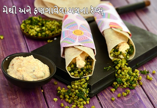 મેથી અને મૂંગ સ્પ્રાઉટ્સ રેપ રેસીપી | ફણગાવેલા મૂંગ રેપ | વજન ઘટાડવા માટે ફણગાવેલા મૂંગ રોલ | ડાયાબિટીસ માટે સ્વસ્થ ભારતીય રેપ | એક મેથી અને મૂંગ સ્પ્રાઉટ્સ રેપ તમારા ભલામણ કરેલ ડાયેટરી એલાઉન્સ (RDA) ના 9% આયર્ન, 16% પ્રોટીન, 53% ફોલિક એસિડ, 23% કેલ્શિયમ આપે છે.