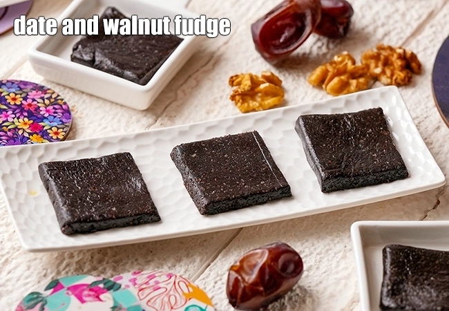 Date and Walnut Fudge recipe | healthy chocolate fudge | dates, cocoa powder and walnut squares | no sugar Indian fudge